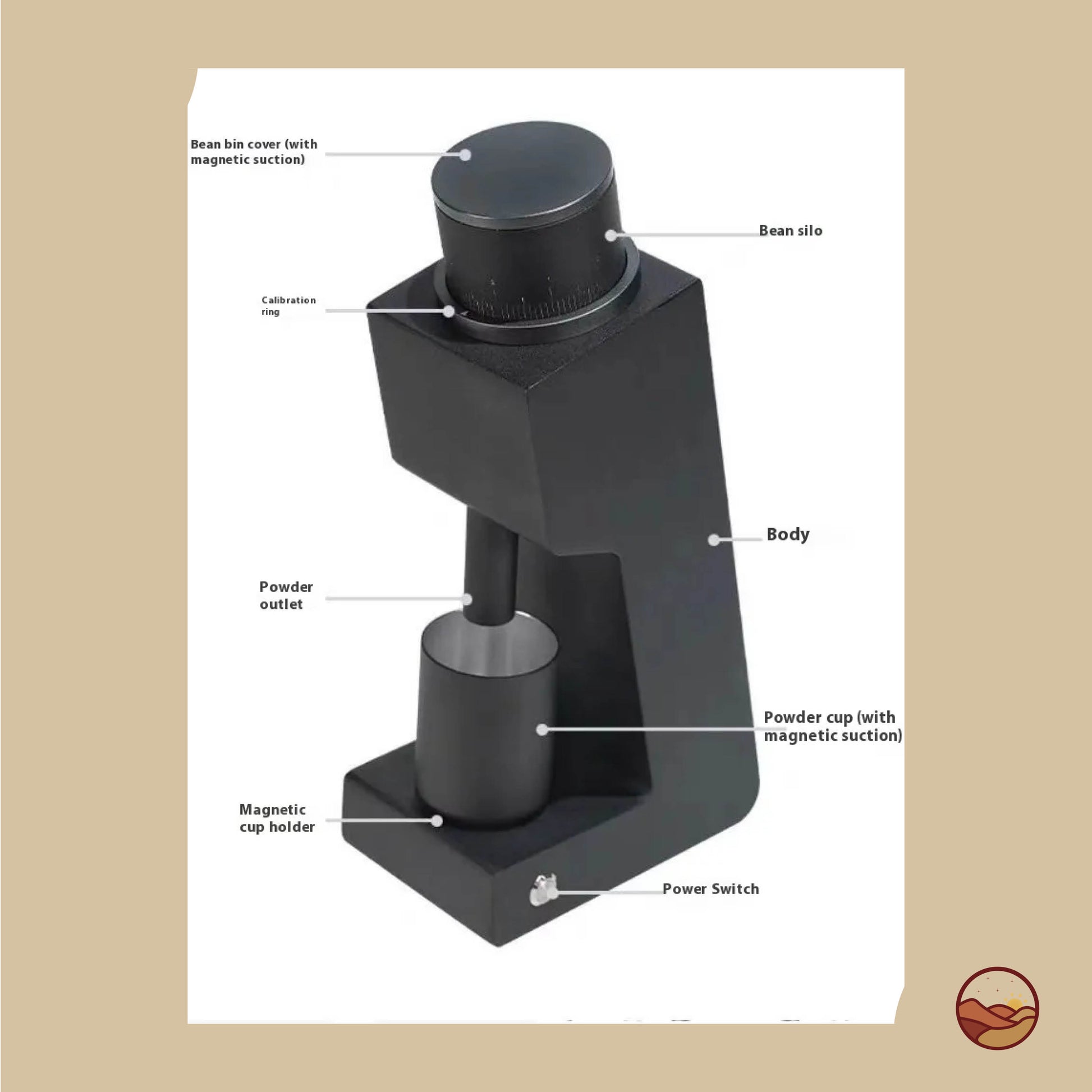 Compact electric coffee grinder made of durable aluminum alloy. Suitable for home, office, restaurant, and outdoor settings. Available in black or white.