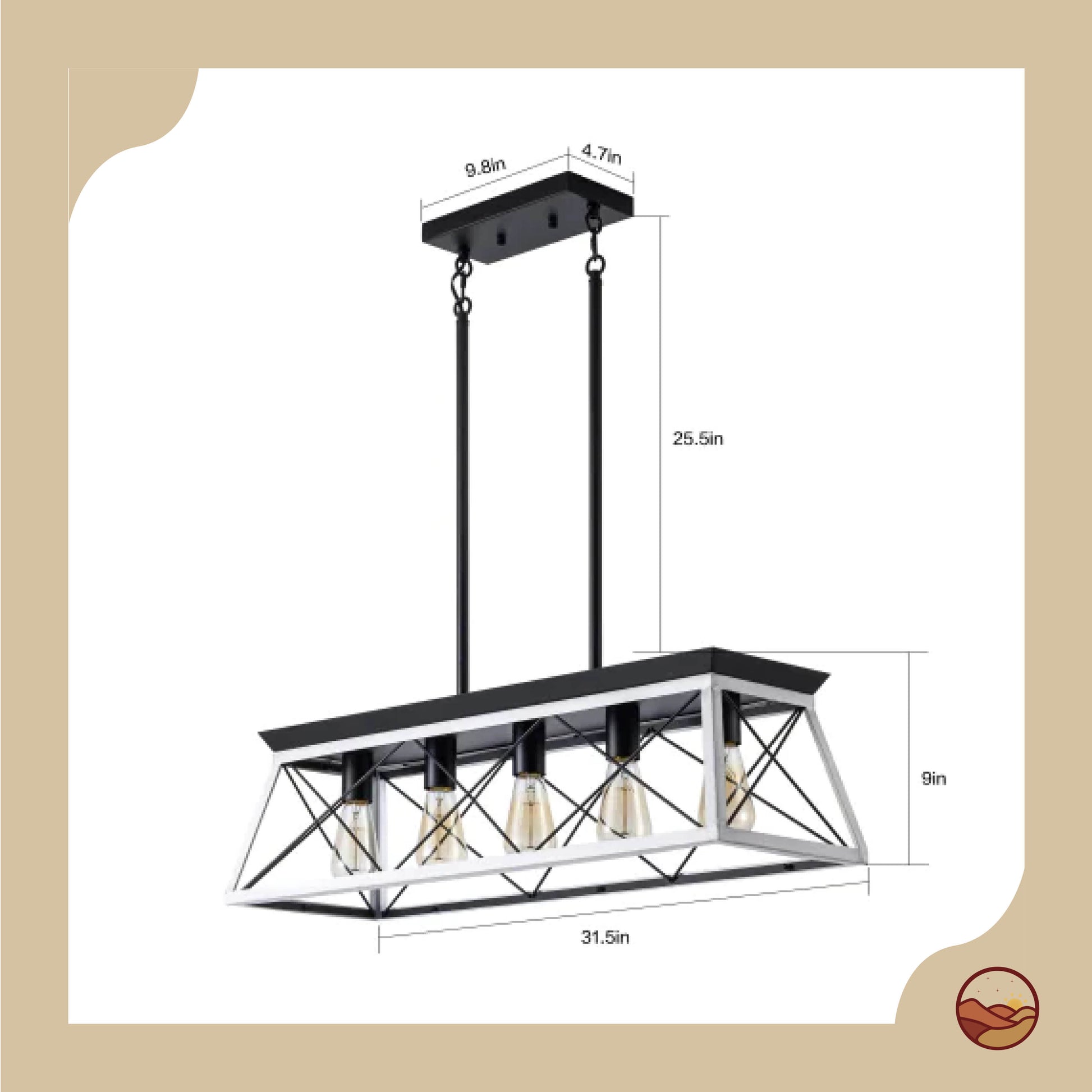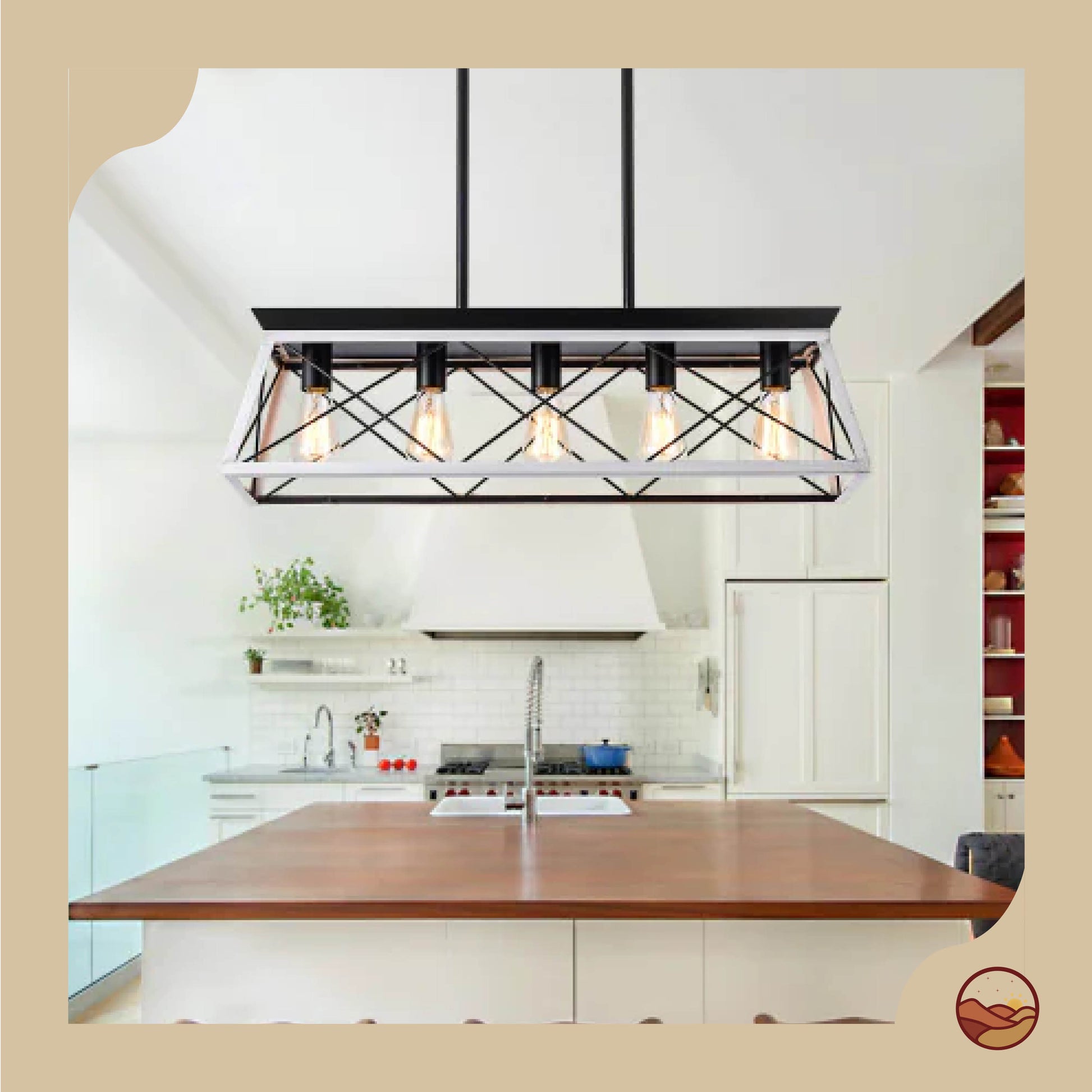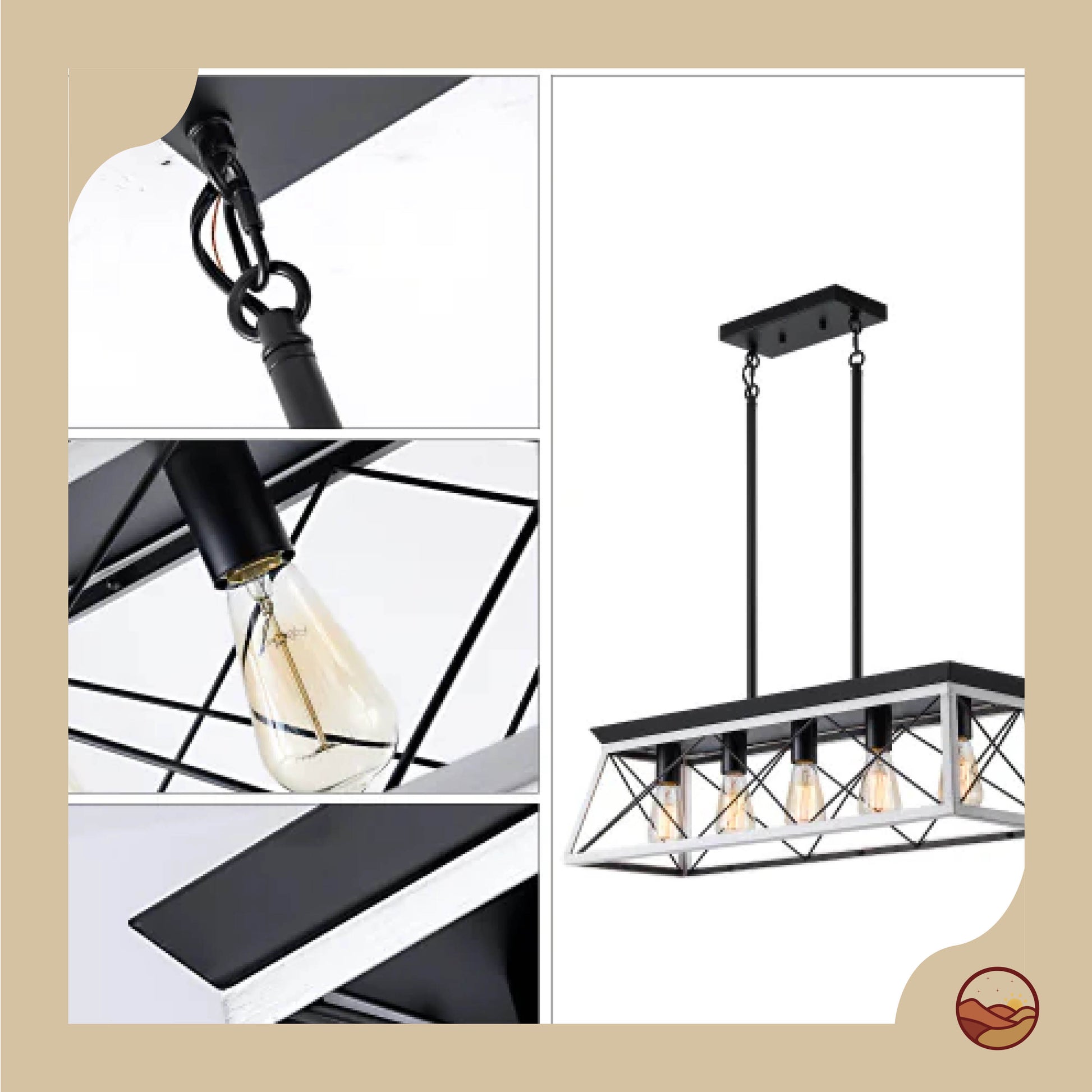 Bring timeless rustic charm to your dining space with this 5-light farmhouse chandelier. Crafted from iron and wood in a chic white and black finish, its geometric design and adjustable hanging height make it perfect for dining rooms, kitchens, bedrooms, or entryways. Compatible with E26 bulbs up to 60W (not included) and fully dimmable with an appropriate dimmer switch. Easy and safe to install.