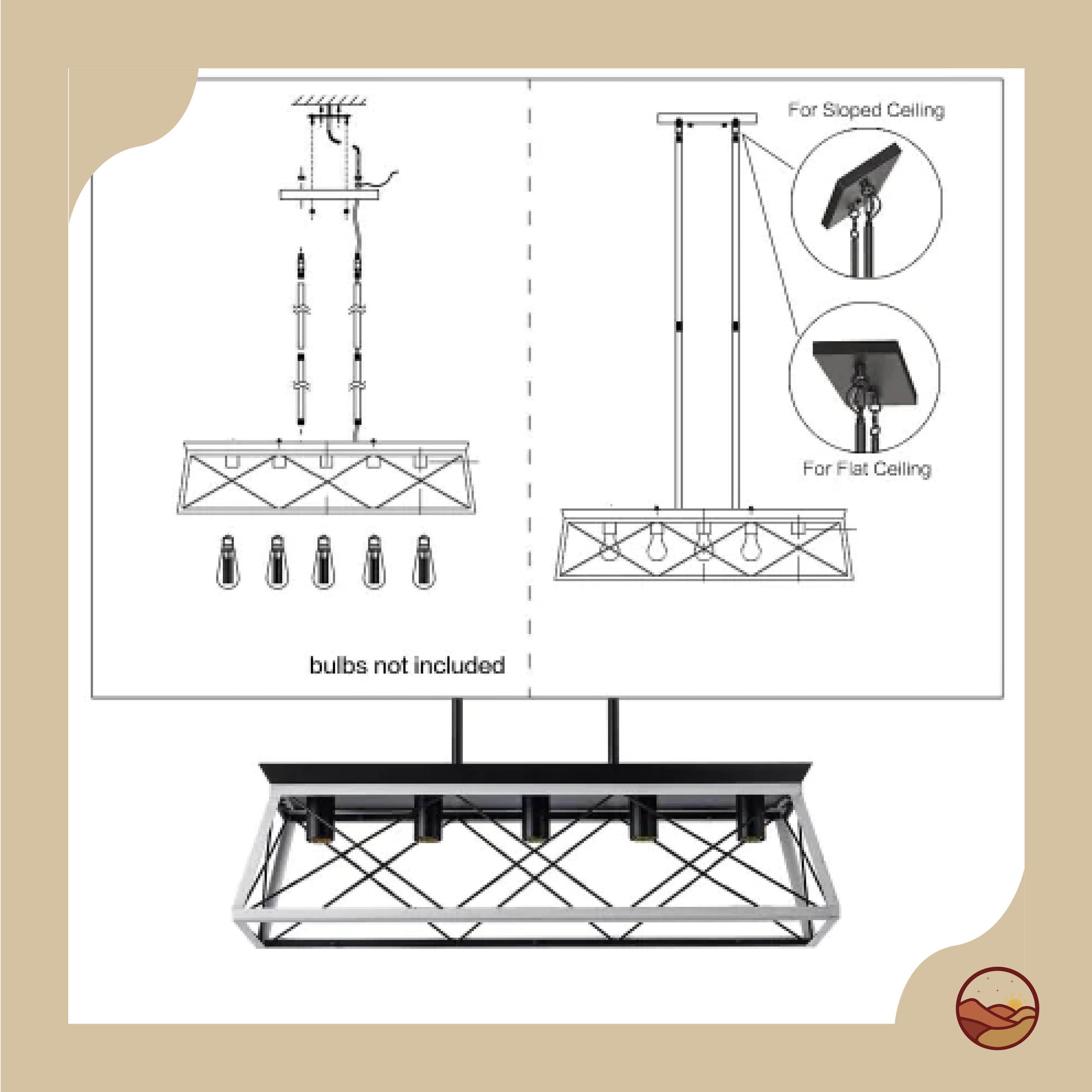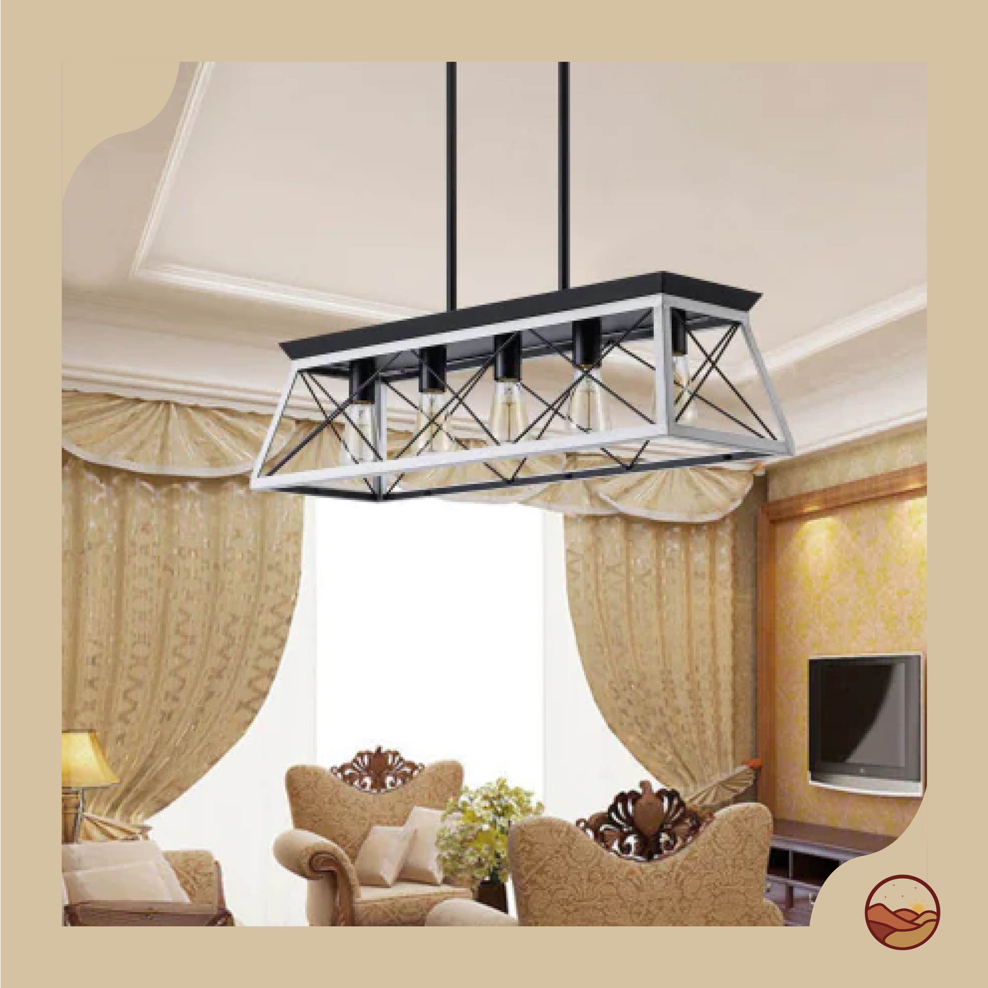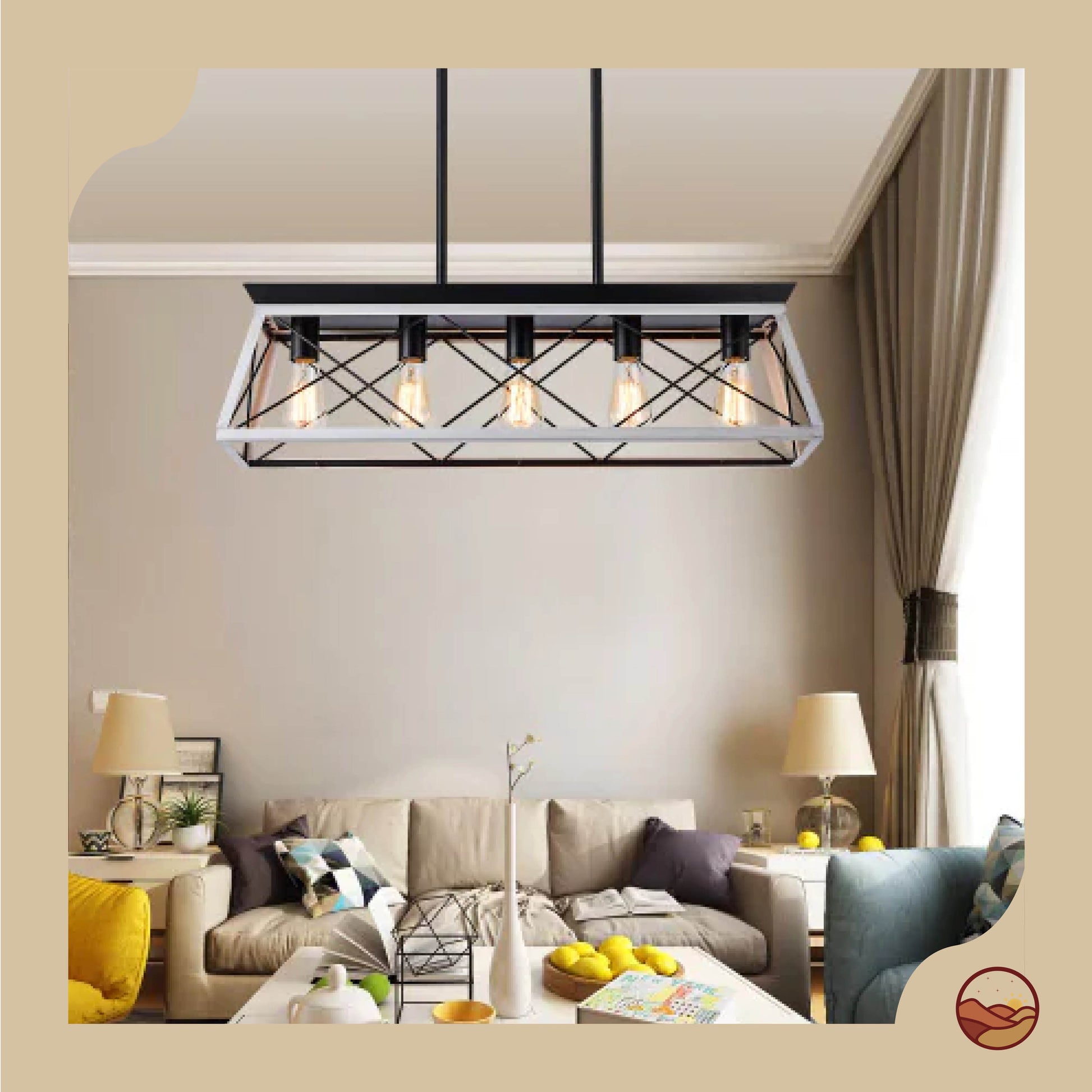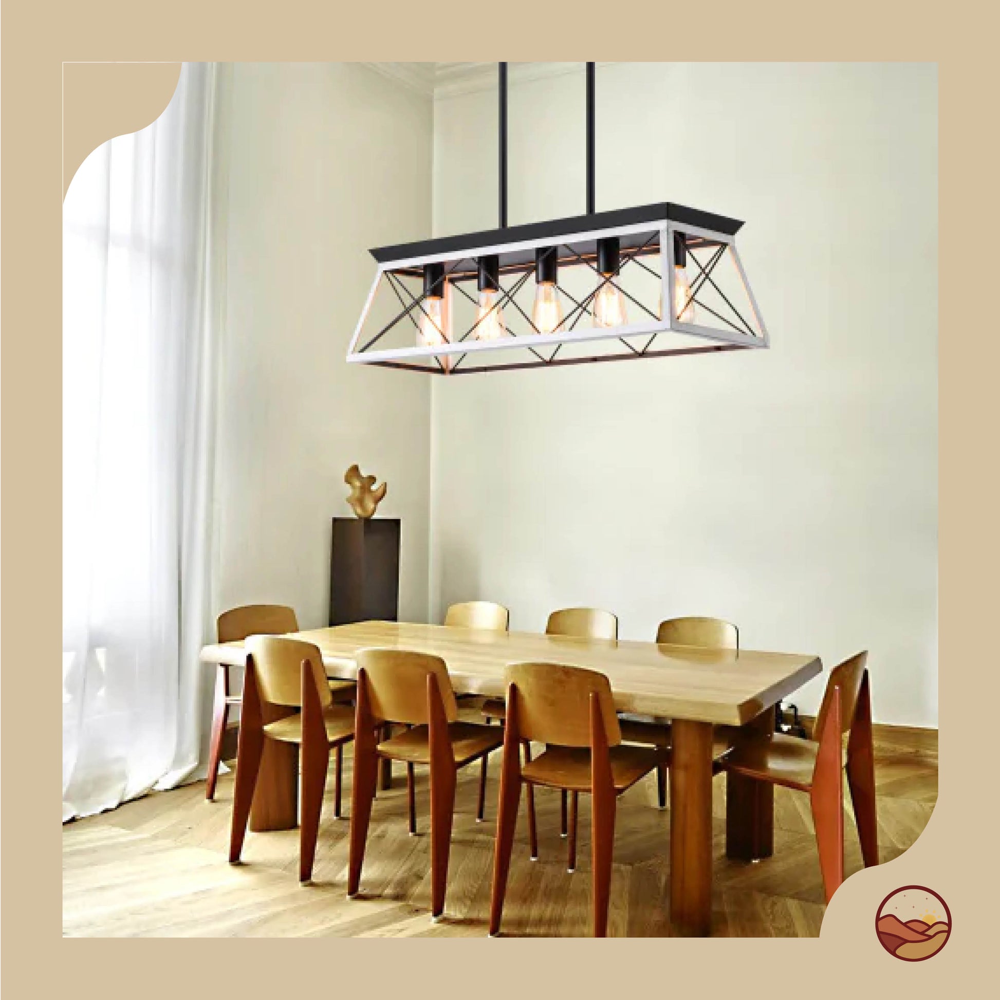 Bring timeless rustic charm to your dining space with this 5-light farmhouse chandelier. Crafted from iron and wood in a chic white and black finish, its geometric design and adjustable hanging height make it perfect for dining rooms, kitchens, bedrooms, or entryways. Compatible with E26 bulbs up to 60W (not included) and fully dimmable with an appropriate dimmer switch. Easy and safe to install.