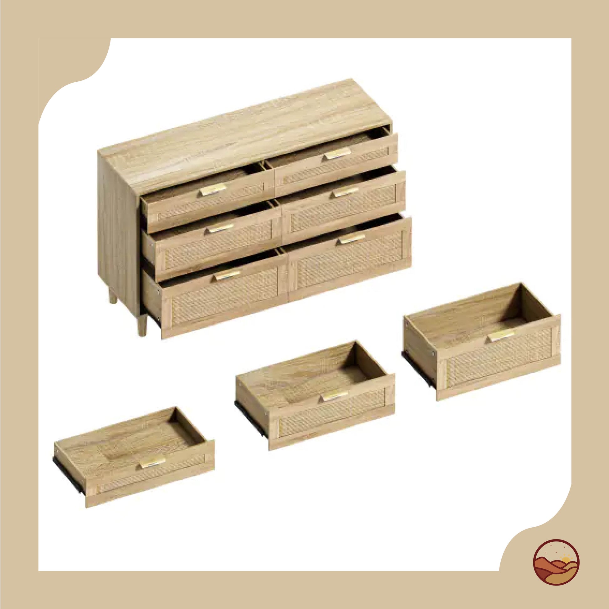 Modest natural rattan dresser with 6 spacious drawers, metal handles, and wood legs. This storage cabinet offers ample space for clothes, plants, and decor in bedrooms or living spaces. Made with eco-friendly MDF and metal, features anti-tip safety and smooth assembly.