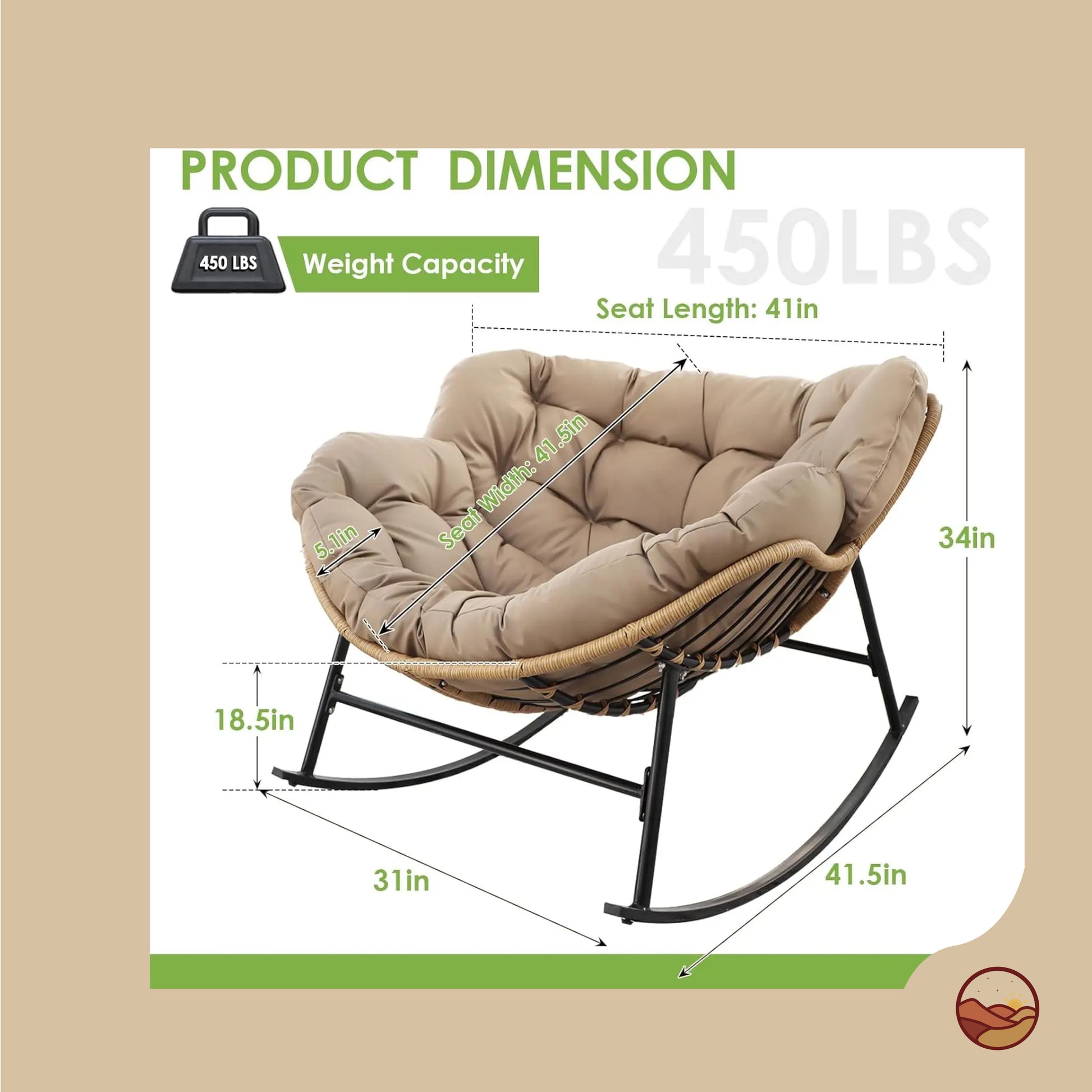 Spacious and Sturdy: rocking chair 41" x 41.5 " x 34 "(including the cushion) and features powder coated alloy steel frame that supports up to 450 pounds. our rattan and metal frame is weather resistant for outdoor