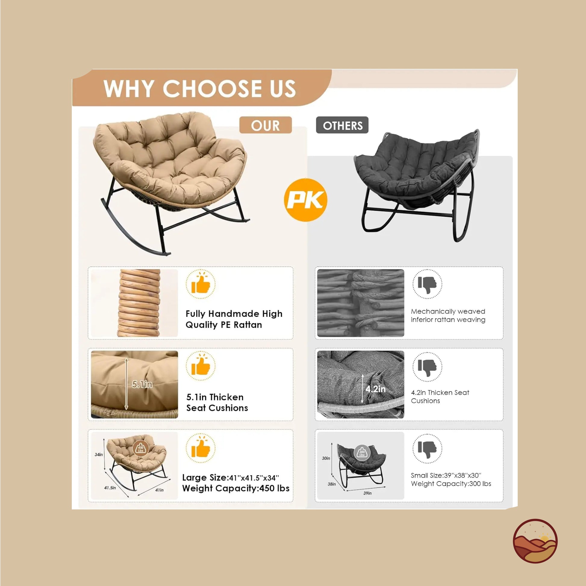 Attention to Detail: Because of the rubber pads on the bottom, chair can rock smoothly and quietly adjustable safety screws for stability. The 5.1-inch thick cushion paired with a water resistant cushion cover enhances comfort. Hand-woven PE rattan adds a unique, stylish touch while offering added protection