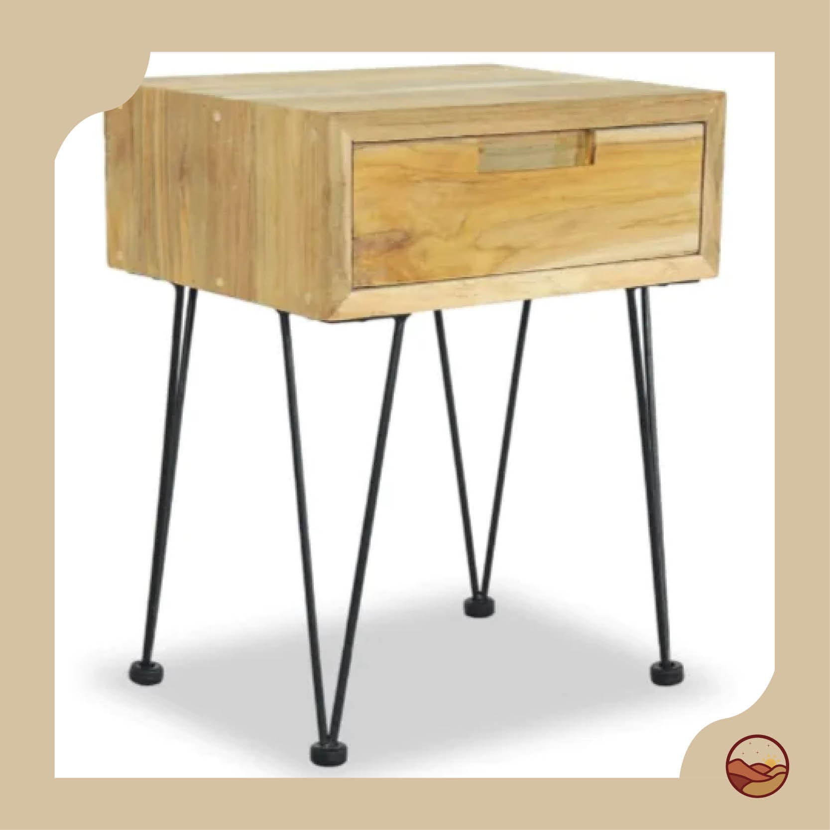 Rustic solid teak bedside cabinet with a sturdy hardwood top and wrought iron legs. Features a spacious drawer for storage and can double as a nightstand, end table, or telephone table. Each piece is unique with natural wood variations. Easy to assemble.